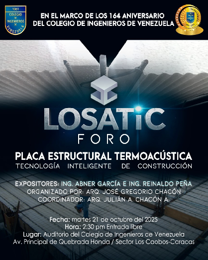 Conferencia el próximo martes 21 de octubre 2025 Placa Estructural Termoacústica a cargo de los Ingenieros Abner García y Reinaldo Peña en el auditorio del Colegio de Ingenieros de Venezuela